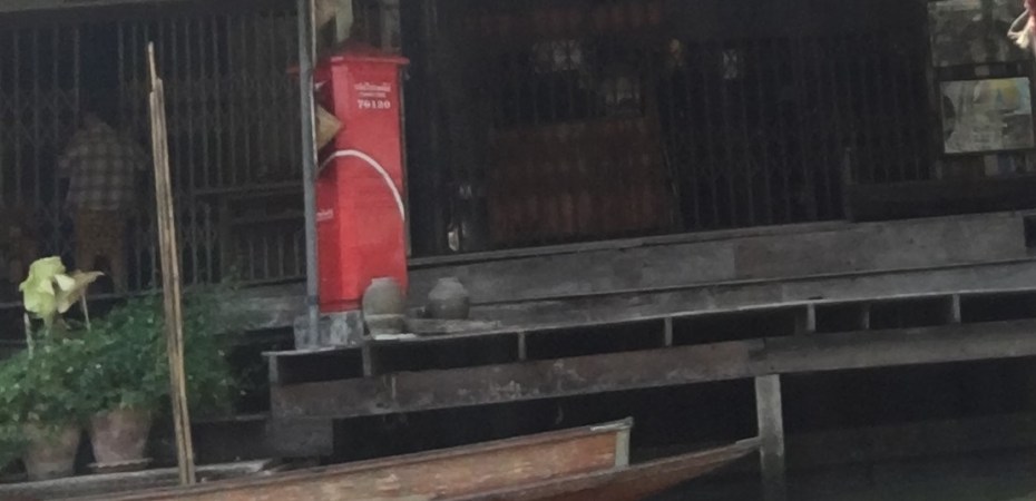 You must definitely test your bargaining skills – feels good if you have made a deal ! Malati picked up some spices as souvenirs and we were back in the boat to cruise the canals. But her prized piece was a mortar and pestle which weighed nearly 10 Kilos – For the life of me I could not figure out why she did not buy it back home in India. It was a good buy and back home in India the mixer has now given way to hand pound spices. We stopped by a floating vendor for lunch and had the most amazing papaya salad – supposedly vegetarian but spiced with a lot of tiny pieces of shrimp. Hesitantly we ate a plate each and hoped that our stomachs would bear this onslaught – To our happiness we were fine and went on to the next momo boat and topped off the meal with a coke with a Thai mango. The canal abounds with tourist boats spewing diesel fumes which completely spoils the atmosphere – literally as well.