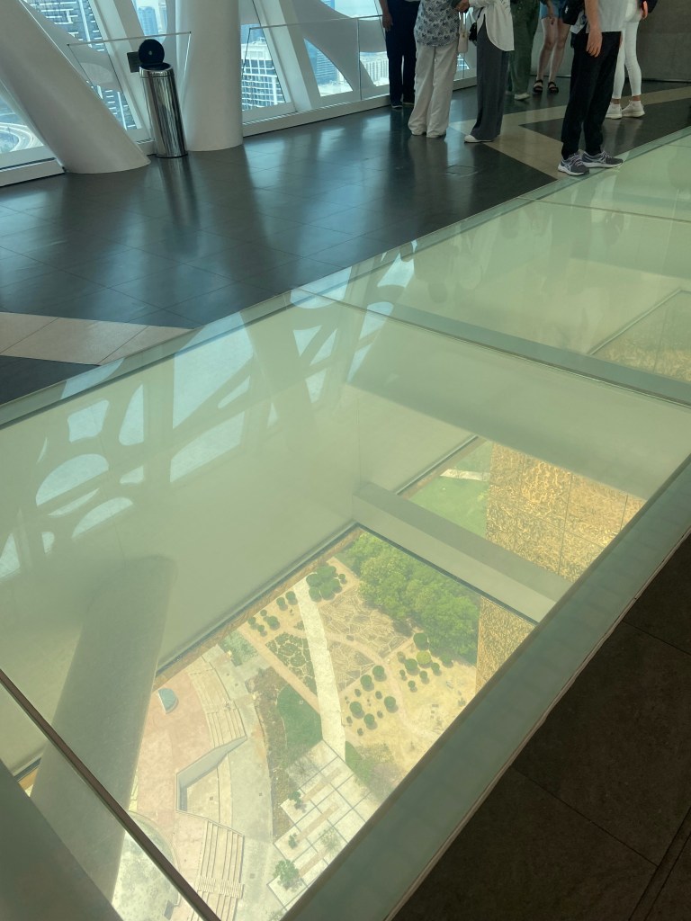 The 150 meter tall structure was built in 2008 and is situated within the Zabeel park.The park is the largest in Dubai and offers many modern sporting facilities which we found deserted when we went there. Possibly because of the mid day heat. After paying an entry fee of 52.50 AED at the gate and a short walk in the blistering sun you enter the Dubai frame complex. As you head towards the high speed elevators you are treated to an exhibition showing the evolution of Dubai from fishing village to the modern day. In 45 secs you are transported to the top of the frame. The two towers at the top are connected through a opaque glass way which turns transparent with movement. Looking down 48 floors even through glass is quite a eerie feeling and both Malati and took quite a while before we braved the crossing! The view from the top is breathtaking – one the one side you have the modern Dubai and the other side the old. As with any other tourist spots there are paid photo ops, souvenir shops and restaurants in the complex.