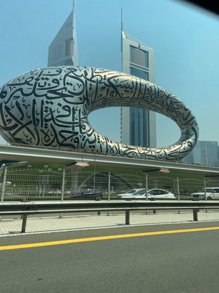 We got back onto the Sheikh Zayed Road and headed to the Museum of the Future – The most recent of the iconic structures of Dubai – opened on “two’s” day in 2022 . Shaped like a Torus it brought back memories of my engineering mathematics which I studied nearly 50 years ago . “A simple definition of a Torus is ” a surface or solid formed by rotating a closed curve, especially a circle, about a line which lies in the same plane but does not intersect it (e.g. like a ring doughnut).” Source Oxford dictionary.