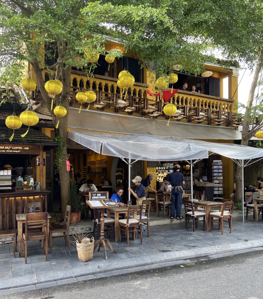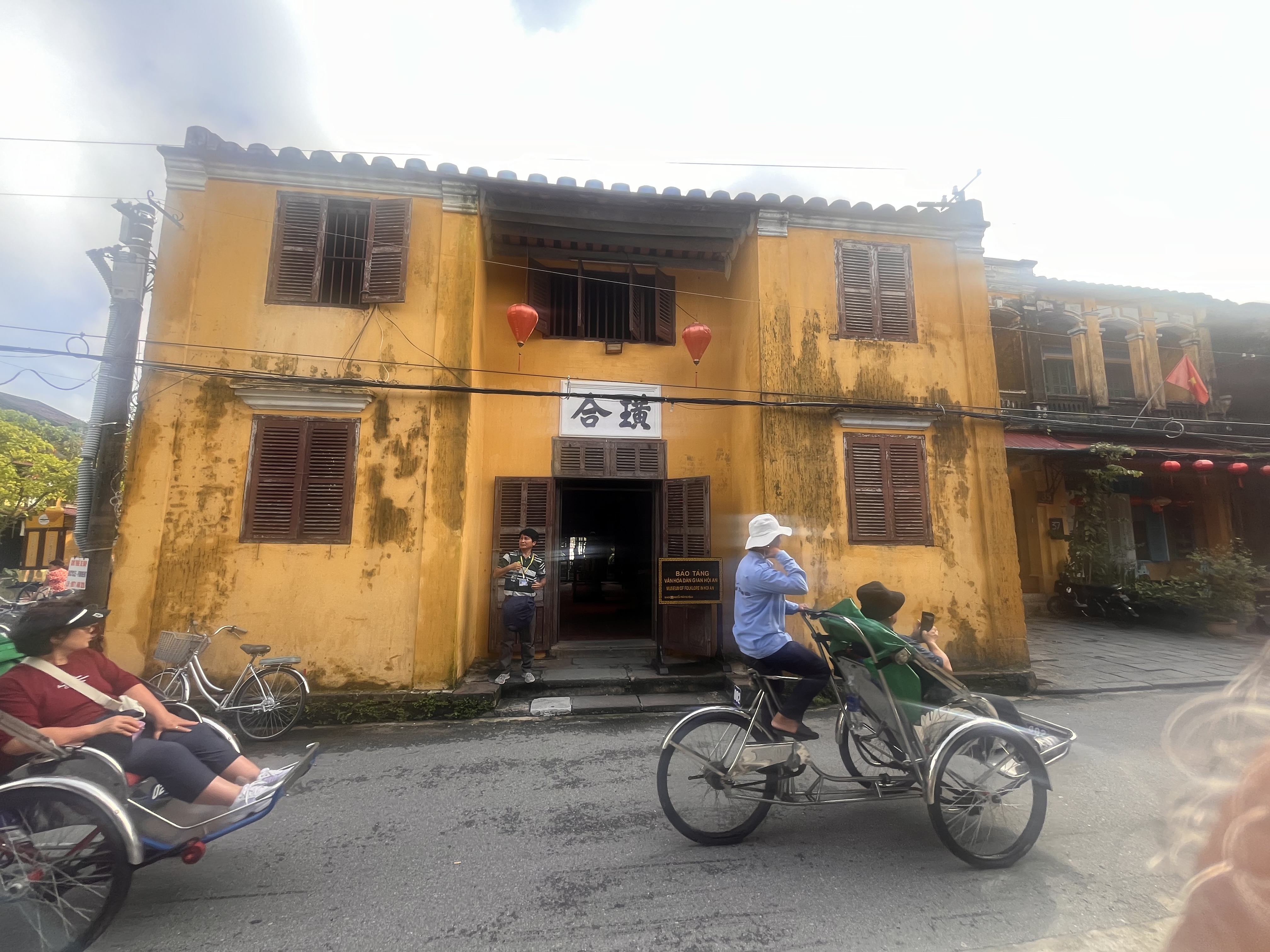 A pleasant walk led us through the streets lined with buildings which still reflect the architecture of the Chinese , Japanese and European styles, But first the pagodas and the temples .The Chua Phap Bao pagoda as you enter the old quarter is a peaceful place on a busy road. We just walked through and appreciated the gardens and the statues of Buddha onwards