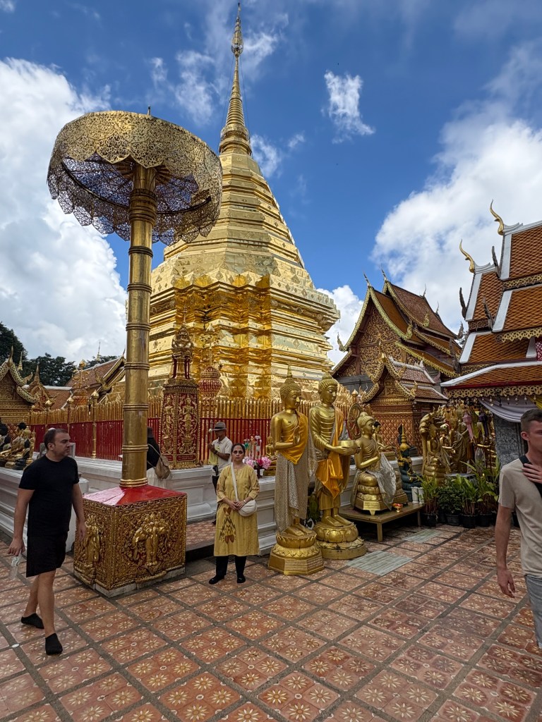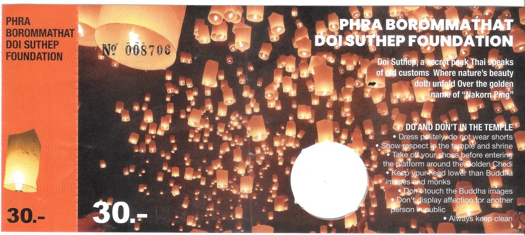 Doi Suthep is a half hour’s drive from Chiang Mai through a green forested route, Doi Suthep is the name of the mountain and the temple takes it name from it as does the national park around it. The full name of the temple is Wat Phra That Doi Suthep or simply “the sacred temple of the relic at Doi Suthep”. This is considered one of the most sacred temples in Thailand and classified by the Royals as a Class Two temple. The temple is a must visit for every tourist to Chiang Mai. A short drive past the Chiang Mai university and the zoo through a lushly forested route takes you to the foot of the Doi Suthep mountain. Access to the top is by a 300 steps stairway called the Naga stair case due to the statues of the Naga along the stair or through a cable car. We took the easy way up and in less than five minutes we were at the top of the mountain at the entrance to the temple