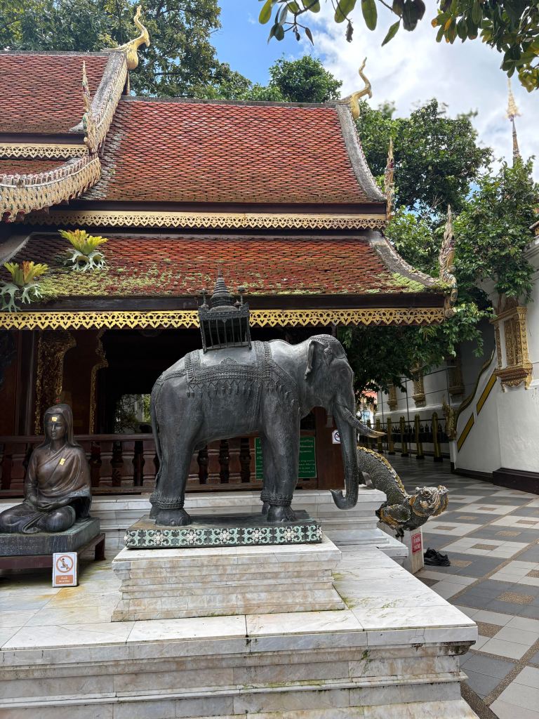 Buddhism flourished during the reign of the Lanna dynasty and numerous temples were built in the hey days of the dynasty (1200s to 1500s) – This temple was one of them . In the most widely accepted version a bone with magical powers, said to be Buddha’s shoulder bone was presented before the King Kuena ( the fifth king in the Lanna dynasty) who ordered it placed on an elephant who was then set loose. As the story goes, the elephant reached the top of the mountain, trumpeted and died on that spot. This was considerd a sign from the gods and the temple of Doi Suthep was build at that location. While according to another version it was a white elephant While there is also a statue of the white elephant in the temple , this elephant (see pic alongside) and plaque placed right behind the elephant narrates the legend of the temple making it perhaps the official version!~ . Yet another version amplifies that the shoulder bone of the Lord Buddha had magical powers and split into two – one of which is housed here at Doi Suthep.
