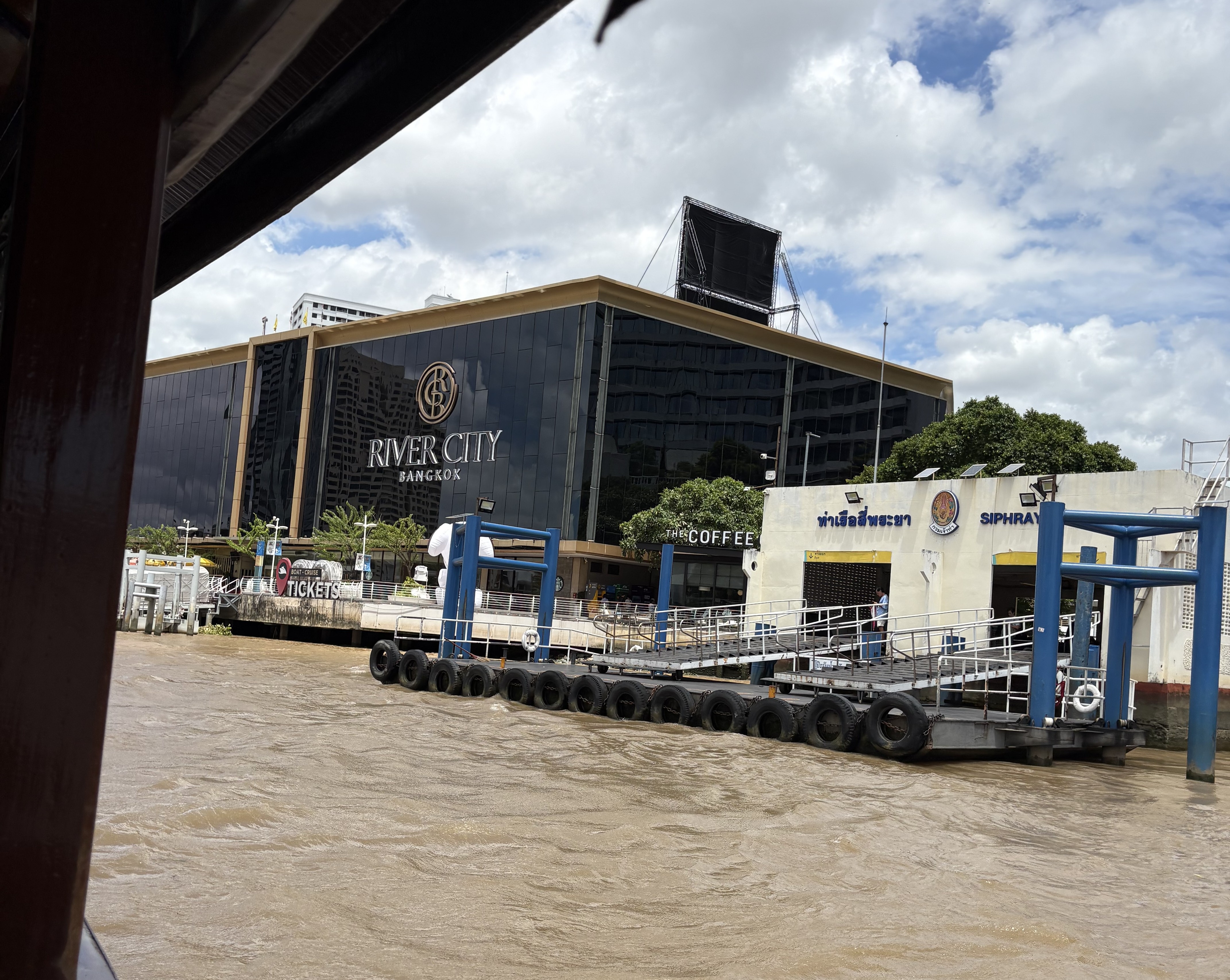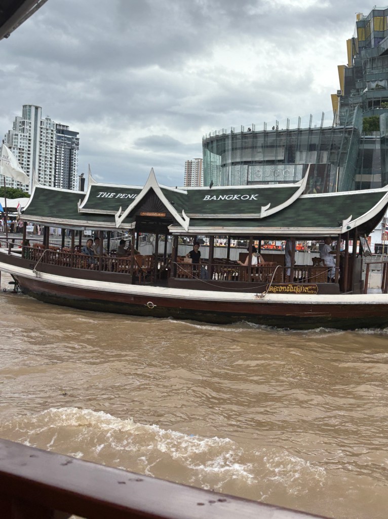 The Chai Praya river flows past Bangkok and meanders its way into the Gulf of Thailand some 15 km down stream of the city. The river is about 1200 m wide and a muddy brown in colour with tidal variations, And there is a lot of activity on the river – For one many hotels and attractions are situated on both sides of the river ; many of them having their own private fleet of boats which shuttle between the hotel, malls and the jettys connecting to the BTS and tourist spots. Add to this the river cruise ships often offering lunch and dinner cruises, And more in the form of water transport buses operating along the river and stopping at all the jetties .These boats fly orange , blue and yellow flags depending on the class and route covering a stretch of approx 35 km along the river. Add to this fleet a few police and marine boats, fishing boats, barges and launches which makes it quite a busy water way with a large flotilla.